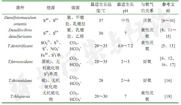 應(yīng)用微生物脫硫的研究是伴隨著利用微生物選礦的研究而開始的。1947年,COLMER等發(fā)現(xiàn)并證實化能自養(yǎng)細(xì)菌能促進(jìn)氧化并溶解煤炭中存在的黃鐵礦,這被認(rèn)為是生物濕法冶金研究的開始。在20世紀(jì)50年代,LEATHAN等就分別發(fā)現(xiàn)某些化能自養(yǎng)微生物與煤中的硫化鐵的氧化有關(guān),并從煤礦廢水中分離出氧化亞鐵硫桿菌(Thiobacillusferrooxidans)[4]。1984年,POSTGATE在其著作中對硫酸鹽還原菌(SRB)進(jìn)行了系統(tǒng)的闡述,這類微生物能利用各種有機(jī)物作為電子供體,使亞硫酸鹽和硫酸鹽作為最終電子受體并還原為硫化物。1988年,美國Tulsa大學(xué)的DASU等[5]將這類微生物用于SO2氣體的轉(zhuǎn)化中,開始了微生物脫除SO2氣體的應(yīng)用研究。日本千代田公司發(fā)展的稀硫酸吸收法(簡稱千代田法),是目前在日本應(yīng)用較廣的煙道氣脫硫方法。王安等[6]采用氧化亞鐵硫桿菌(T.ferrooxidans)脫除煙氣中的SO2。在相同操作條件下,比較了千代田法與微生物法的優(yōu)劣,結(jié)果表明,在通氣時間相同的情況下,微生物法脫硫率遠(yuǎn)大于千代田法。即便是在較低(12.5L/Nm3)的液氣比下都有較高(98.5%)的脫硫率。而此時千代田法只有60.0%的脫硫率。Fe3+對千代田法的影響是很明顯的,F(xiàn)e3+質(zhì)量濃度小于1.0g/L時脫硫率明顯下降。微生物法在Fe3+質(zhì)量濃度大于0.6g/L時,脫硫率大于98.0%,比千代田法的效果好得多。張永奎等[7]用分離所得的氧化亞鐵硫桿菌(T.ferrooxidans)和Fe3+體系處理含SO2氣體的試驗研究,結(jié)果表明,細(xì)菌菌液比稀硫酸吸收法的脫硫效率更高。目前,國內(nèi)外報道的可用于脫硫的微生物多數(shù)是化能自養(yǎng)菌。利用自養(yǎng)微生物脫硫,營養(yǎng)要求低,且無二次污染。至今已發(fā)現(xiàn)能用于脫除煙氣SO2的菌主要有東方脫硫腸狀菌(Desulfotomaculumorientis)、脫硫脫硫弧菌(Desulfovibriodesulfuricans)、脫氮硫桿菌(T.denitrificans)、氧化亞鐵硫桿菌(T.ferrooxidans)、氧化硫硫桿菌(T.thiooxidans)和排硫硫桿菌(T.thloparus)等,見表1。
