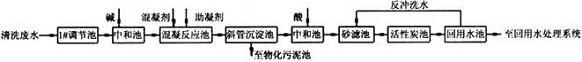 清洗廢水流入調(diào)節(jié)池調(diào)節(jié)水質(zhì)水量后,由提升泵泵入中和池,加入堿液調(diào)節(jié)pH,再流入混凝池及助凝池。加入混凝劑和助凝劑后,廢水中的重金屬離子以及部分膠體類有機物形成絮狀體,流入沉淀池進行泥水分離。然后,污泥排入物化污泥池,沉淀池的出水流入中和池調(diào)節(jié)pH后,經(jīng)砂濾池和活性碳池后流入回用水池。