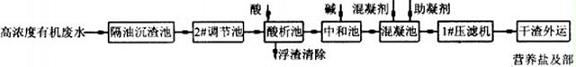 高濃有機廢水來自于各除膠、除油、顯影、脫膜、綠油工序等,其COD濃度很高,一般達3000-8000mg/L,是一種污染較嚴重的廢水,此類廢水單獨收集后,經(jīng)隔油沉渣池除去浮油等雜志后,進入調(diào)節(jié)池調(diào)節(jié)水質(zhì)水量,再由廢水泵打入酸析池,由pH在線儀控制投加酸液,在酸性條件下,廢水中的有機物析出浮于水面,定時清除。酸析后加堿調(diào)節(jié)pH,然后投加混凝劑,反應(yīng)后再用氣動隔膜泵打入廂式壓濾機進行渣水分離。此時,廢水中的油墨和懸浮物截留于廂式壓濾機內(nèi),濾液排出,作進一步處理。