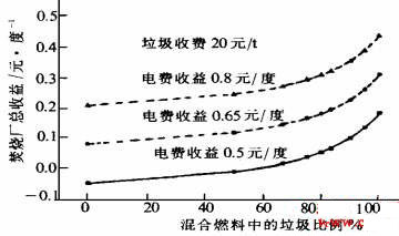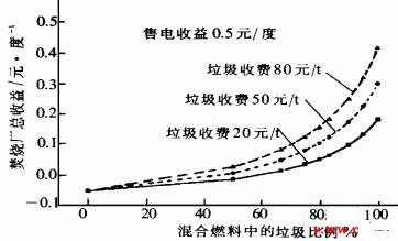 從經(jīng)濟可行性方面看煤與垃圾混燒技術(shù),一是由于采用混燒方式大大提高了燃料的熱值并能減輕Cl帶來的高溫腐蝕問題,因此可以產(chǎn)生較高參數(shù)的蒸汽(如中溫中壓蒸汽)來驅(qū)動汽輪機發(fā)電,從而提高了垃圾發(fā)電效率,如發(fā)電效率可達(dá)20%以上;二是從建造成本來說,在發(fā)電量相同的情況下,采用混燒技術(shù)大大降低了投資成本,如建造一座日處理垃圾量500t/d的混燒發(fā)電機組,按煤和垃圾的質(zhì)量比為1∶5計算,可以產(chǎn)生相當(dāng)于12MW的電力,而如果采用純燒垃圾,500t /d的垃圾量僅可發(fā)出6MW的電力,而垃圾處理能力相同的混燒爐與純燒垃圾爐的投資規(guī)模和建設(shè)周期相當(dāng),可見,混燒發(fā)電機組的每kW投資額約為純燒垃圾機組的一半,顯然,通過售電回收投資成本的焚燒發(fā)電廠愿意選擇混燒的發(fā)電方式。垃圾焚燒廠的經(jīng)濟收入一般來自于政府,有售電收入和垃圾處理收費2種。為了比較不同煤與垃圾混合比例下的焚燒發(fā)電廠收益情況,計算的基礎(chǔ)為:焚燒發(fā)電功率12MW、自用電耗15%、每kW設(shè)備投資額8300元、煤價200元/t、其它資金0.104元/度,計算時取煤和垃圾的低位熱值分別為22358kJ/kg和4500kJ/kg。考慮到發(fā)電收入、垃圾處理收費補貼、運行成本 (電、煤、石灰等耗費、人員工資、流動資金)、設(shè)備投資(包括還貸付息)等因素,采用下式對焚燒廠每發(fā)1度電的總收益進(jìn)行粗略的估算:焚燒廠收益=上網(wǎng)電價+垃圾收費-運行成本設(shè)備投資
