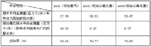 為解決這一難題,我們?cè)诔浞终{(diào)研的基礎(chǔ)上,唐山市自來水公司于2002年改用了投加二氧化氯進(jìn)行原水預(yù)處理的方法,以減少藻類對(duì)水質(zhì)的影響。經(jīng)過近兩年的運(yùn)行和監(jiān)測(cè),結(jié)果是令人滿意的。