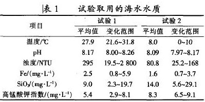 從表l可以看出。試驗1和試驗2取用的海水差別較大,除了pH較為接近外,試驗1取用的海水溫度較高,濁度較大,且隨潮位的變化波動非常大,含鐵量較試驗2取用的海水高。而膠硅和高錳酸鉀指數(shù)較小。