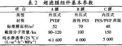 試驗主要設備是一套混凝設備和4套集裝箱式的超濾中試設備。其中,混凝設備為渦旋混凝澄清池.該混凝澄清池有效容積為5m,其中混合反應區(qū)為2.56m,澄清區(qū)為2.44m。,設計產(chǎn)水流量是8ma/h。超濾膜設備來自不同廠家,編號分別為A膜、B膜、C膜,其基本參數(shù)見表2。