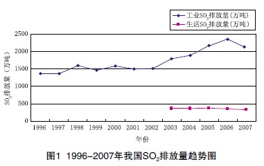 1996-2007年我國SO2排放量趨勢見圖1。
