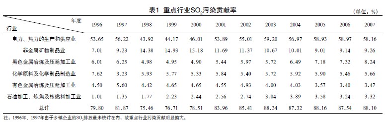 國內(nèi)重點行業(yè)SO2污染貢獻率見表1。