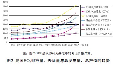 圖2為我國1996-2007年工業(yè)SO2排放量與經(jīng)濟增長、第二產(chǎn)業(yè)產(chǎn)值、發(fā)電量變化趨勢等的比較折線圖。