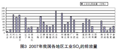 圖3為2007年我國31個省市第二產(chǎn)業(yè)產(chǎn)值SO2的排放量柱狀圖。