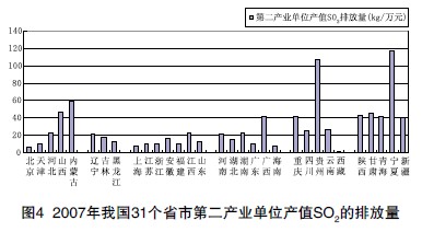 圖4為2007年我國31個省市第二產(chǎn)業(yè)單位產(chǎn)值SO2的排放量柱狀圖。