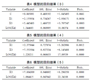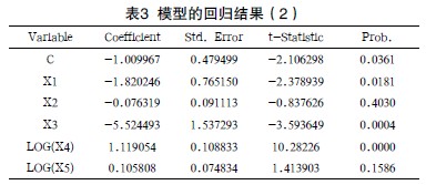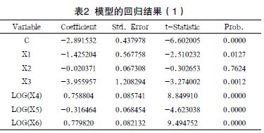 通過Eviews軟件,利用30個省市數(shù)據(jù)得到的結(jié)果如表2所示。結(jié)果表明,X1、X2都不顯著,X3、X4、X5顯著。