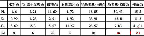 由表5可以看出,陳腐生活垃圾固結(jié)體中的重金屬離子Pb、Zn、Cr、Cd的分布形態(tài),Pb的酸溶態(tài)占11.69%,這部分屬于重金屬碳酸鹽和氫氧化物,在酸性條件下易浸出,在這一形態(tài)中的百分含量不到12%不會超過國家排放標準;非晶型氧化鐵占16.85%,這部分屬于重金屬硫酸鹽、重金屬單體和氧化物鉻酸鹽等,這種形態(tài)下重金屬離子是較難浸出的;晶型氧化鐵態(tài)占50.43%,這部分屬于重金屬硫酸鹽、重金屬單質(zhì)和氧化鉻酸鹽等,較難被還原,重金屬離子很難浸出;殘渣態(tài)占15.5%,屬于硅酸鹽、鋁—硅酸鹽、重金屬單質(zhì)和氧化物,重金屬離子在這種形態(tài)時不可能浸出。85%以上的Zn、Cr、Cd離子都在有機結(jié)合態(tài)和非晶型鐵氧化態(tài)、晶型氧化鐵、殘渣態(tài)形態(tài)存在于固結(jié)體中,說明固結(jié)劑引發(fā)的物理化學反應(yīng)連同重金屬離子一起反應(yīng)生成了重金屬硫酸鹽、重金屬單質(zhì)和氧化物鉻酸鹽、硅酸鹽、重金屬單質(zhì)和氧化物等穩(wěn)定的礦物相,在自然條件下,重金屬離子基本上不可能浸出。陳腐垃圾固結(jié)體可以安全地在工程中使用。