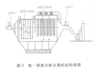 電袋復(fù)合型除塵器主要構(gòu)成部分:(1)煙氣進(jìn)口,(2)預(yù)處理室,(3)布風(fēng)裝置,(4)電除塵單元,(5)導(dǎo)流裝置,(6)清灰裝置,(7)凈氣室,(8)袋除收塵單元,(9)測控裝置,(10)煙氣出口,(11)風(fēng)機,(12)隔板,(13)灰斗,(14)卸灰裝置。