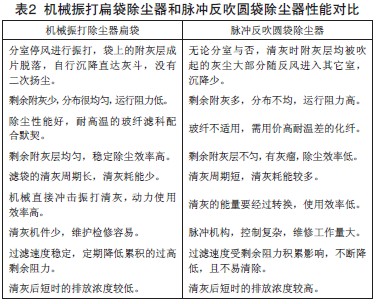 機(jī)械振打扁袋除塵器和脈沖反吹圓袋除塵器對比見表2。