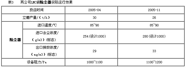 由表2和表3看出,兩家公司使用的設(shè)備在2005年先后投入使用,在近兩年的運(yùn)行中達(dá)到了設(shè)計(jì)要求,出口排放濃度<50mg/m3,達(dá)到了國(guó)家標(biāo)準(zhǔn),設(shè)備隨主機(jī)運(yùn)轉(zhuǎn)率達(dá)到100%,滿足系統(tǒng)需要。