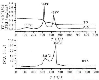 實(shí)驗(yàn)采用日本理學(xué)熱分析儀TAS100高溫微分差熱天平進(jìn)行。實(shí)驗(yàn)時(shí)將準(zhǔn)備分析的試樣放在坩鍋內(nèi),通以空氣,使試樣在空氣氛圍中連續(xù)升溫,記錄試樣在升溫過(guò)程中TG(熱重,即重量隨溫度的變化)、DTG(熱重的微分即失重速率)及DTA(差熱分析即吸熱或放熱變化規(guī)律)隨溫度的變化曲線,如圖1所示。實(shí)驗(yàn)條件為:升溫速率2000/min;空氣流量20ml/min;最高加熱溫度900℃。