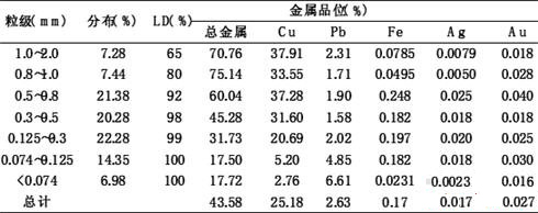 由表1、圖2可見(jiàn),破碎物料中粒徑<0.074mm的物料約占總量的6.98%,85.74%的物料集中分布在0.074~1.0mm粒級(jí)范圍,79.65%的金屬分布在0.125~1.0mm的粒級(jí)中,物料的過(guò)粉碎現(xiàn)象較輕,基本達(dá)到粉碎要求。