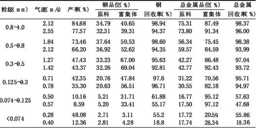 由分選結(jié)果可知:氣流分選廢PCB粉碎物料,不僅能得到品位較高的金屬富集體,而且金屬富集產(chǎn)品產(chǎn)率可觀。本實(shí)驗(yàn)條件下,調(diào)節(jié)合適的操作氣速,0.125~0.1mm中銅的回收率接近95%,90%以上的金屬被回收。0.074~0.125mm的物料,原料顆粒粒度小且金屬含量較低,氣速操作彈性有所減小,金屬回收率降低,但富集效果比較明顯,分選前后金屬富集比接近6。<0.074mm的物料氣流分選,不僅金屬回收率低而且富集效果不明顯。原因一是因?yàn)轭w粒變細(xì),沉降速度越慢,輕、重組分的沉降速度差越小,短時(shí)間在有限裝置內(nèi)很難分離。二是此細(xì)粒級(jí)物料以玻璃纖維和樹(shù)脂為主,物料和裝置壁間的靜電效應(yīng)以及物料間相互團(tuán)聚都會(huì)使部分非金屬顆粒不能被分選出去。因此氣流分選比較適合粒徑>0.074mm的物料分選,<0.074mm的物料更適合離心分選或搖床分選富集金屬,以達(dá)到提高金屬回收率、減少?gòu)U渣的排放量的目的。