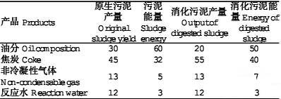 該工藝對原污泥及消化后的污泥均可產(chǎn)生能量,但能量產(chǎn)生效率較大的還是原生污泥。表2是主要生成的產(chǎn)品以及能量產(chǎn)率。通過該裝置后的產(chǎn)物有較好的商業(yè)價值。主要產(chǎn)生3種可以加以利用的產(chǎn)品。合成油:干燥1t污泥生成200~300L油。熱值約為35GJ/L,用于發(fā)電。惰性灰分:穩(wěn)定性很高,主要用于多種建筑產(chǎn)品,如鋪路的磚塊。燃燒熱:可通過燃燒焦炭、非冷凝性氣體、以及反應(yīng)水得到,其可除去干燥污泥的外界能量。
