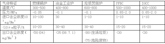 此類煙氣屬于主動(dòng)性煤煙氣,在整體煤氣化聯(lián)合循環(huán)(IGCC)和增壓流化床燃燒聯(lián)合循環(huán)(PFBC-CC)是兩種先進(jìn)燃煤聯(lián)合循環(huán)(ACFCC)的基本方式中,都希望進(jìn)入燃?xì)廨啓C(jī)前送入的為干凈煙氣,特別是對(duì)煙氣顆粒物的去除,因?yàn)轭w粒物的進(jìn)入將會(huì)腐蝕透平機(jī)械葉片上的熱涂層,最終導(dǎo)致對(duì)透平機(jī)械的磨損。這一技術(shù)需要解決的難點(diǎn)就是要求進(jìn)入燃?xì)馔钙礁哌_(dá)900~1300℃的氣體除塵,為了減少固體顆料對(duì)透平機(jī)葉片的高速?zèng)_蝕與高速熔蝕,要求進(jìn)入透平機(jī)中,0~4μm顆料含量小于19.9mg/Nm³,顆料大于5μm的小于0.3mg/Nm³,即要求固體顆料含量小于22.5mg/Nm³。