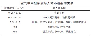 甲醛是一種無色易溶且具有高生物活性和潛在致癌性的微刺激性氣體,其對人體的危害具有長期性、潛伏性和隱蔽性的特點(diǎn)。甲醛對人體具有急性毒作用,主要表現(xiàn)為對眼睛、皮膚、粘膜的刺激,由此產(chǎn)生眼痛、流淚、皮炎等癥狀。氣態(tài)甲醛眼刺激閾為0.06mg/m3,嗅覺刺激閾為 0.06~0.22mg/m3,上呼吸道刺激閾為0.12mg/m3。長期慢性吸入濃度為0.45mg/m3的甲醛可導(dǎo)致慢性呼吸道疾病增加;吸入高濃度甲醛(>60mg/m3)可導(dǎo)致肺炎,喉和肺水腫、支氣管痙攣、喘息、泡沫痰甚至呼吸循環(huán)衰竭致死[1]。甲醛引起人體不適感的濃度參見下表[2]。