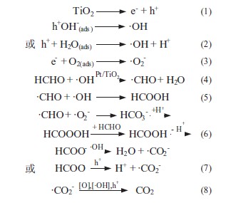 光催化氧化技術(shù)是VOCs治理領(lǐng)域中較為常見的一種方法,且已有部分學(xué)者將該方法用于凈化甲醛。楊建軍等人就曾經(jīng)對甲醛光催化氧化的反應(yīng)機(jī)理做了初步探討[12],認(rèn)為吸附在催化劑表面的空氣中的氧氣和微量水,分別被光生電子和空穴還原或氧化為•O2 -和•OH,為甲醛的深度氧化提供了高活性的氧化劑,而甲醛是通過中間產(chǎn)物HCOOH而氧化為CO2和H2O,并對其可能的反應(yīng)機(jī)理進(jìn)行了推測。