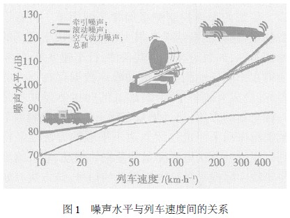軌道交通噪聲對環(huán)境的影響日益受到人們的普遍關(guān)注,特別是在當前高速鐵路技術(shù)發(fā)展迅猛的情況下,隨著行車速度的提高,噪聲水平迅速提高,如圖1 所示。國內(nèi)外一些研究資料表明[1-2]:在不同速度條件下,滾動噪聲是鐵路噪聲輻射的主要來源,而鋼軌振動噪聲在輪軌滾動噪聲中又居主要地位,車輪次之。由于噪聲與振動在500~2000 Hz 頻率范圍內(nèi)線性相關(guān),且鋼軌在此范圍內(nèi)是主要輻射體,因此,抑制鋼軌振動、減小鋼軌的振動加速度和頻率,對降噪起著關(guān)鍵作用。在許多工業(yè)發(fā)達國家,經(jīng)過多年的研究積累,已經(jīng)形成較為完整的軌道交通噪聲測試、評價、控制及整治機制。而我國學者雖也對此進行了一些研究,提出并采取了一些措施[3-8] ,輪軌噪聲有所降低,但隨著我國高速客運專線的建設(shè),由于輪軌噪聲對車速有較強的依賴性,其聲級將愈來愈大,有待于進一步研究。