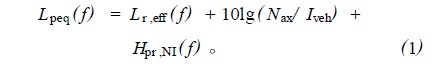 式中: f為1/3倍頻程頻率(Hz);Lpeq(f)為給定速度下等效聲壓譜(dB-20uPa) ;Lr,eff(f) 為給定速度下等效合成有效不平順度(頻率) 譜[dB-1μm];Nax為車軸數(shù);Iveh為車長(m) ; Hpr,NI(f) 為有效不平順度對聲壓的轉(zhuǎn)換函數(shù)(轉(zhuǎn)化為1軸/m[dB-20Pa/ m1/2]) 。