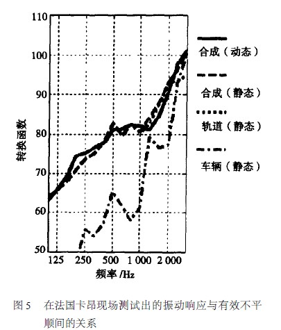 輪軌有效不平順度(這里的不平順度是指波長在5~200mm范圍內(nèi)輪軌接觸表面振幅的變化) ,結(jié)合聲壓測量結(jié)果,根據(jù)有效不平順度(粗糙度) 與聲壓間的簡單關(guān)系就可得到不平順度對聲壓的轉(zhuǎn)換函數(shù)。合成有效不平順度與轉(zhuǎn)換函數(shù)相結(jié)合可用于任何列車速度、任何給定列車軌道系統(tǒng)的噪聲輻射譜預測。