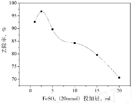 改變Fe ( II)的投加量,保持實驗條件不變,研究Fe ( II)用量對苯酚去除效果的影響,實驗結果見圖1。由圖可知, 100ml苯酚水樣中,當Fe ( II) 用量為2.5ml時去除率最好) ,可達96.7% ,而增大或減少投加量苯酚的去除效果都顯著下降。