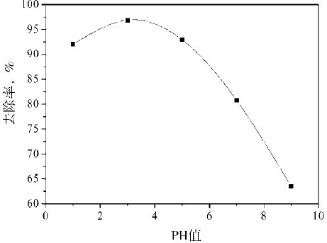 pH對苯酚去除率的影響見圖3所示。由圖3 可知,當初始pH為3時具有較高的去除率,當pH 值較高或較低時去除率明顯下降。分析原因認為當pH較高時, Fe ( II)會被氧化成Fe ( Ⅲ)形成Fe (OH) 3,導致Fe ( II)濃度降低,限制了芬頓反應的發(fā)生。從而降低去除效果。