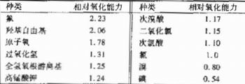 Fenton試劑之所以具有非常高的氧化能力,是因為在Fe2+離子的催化作用下,H2O2的分解活化能低(34.9 kJ/mol),能夠分解產(chǎn)生經(jīng)基自由基HO·。同其他氧化劑相比,羥基自由基具有更高的氧化電極電位,因而具有很強的氧化性能。羥基自由基與其他強氧化劑的氧化能力對比(見表),其中Cl=1.0。