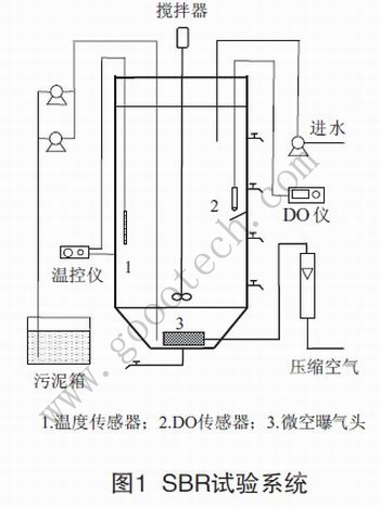 試驗(yàn)裝置及控制系統(tǒng)如圖1 所示。SBR反應(yīng)器為圓柱型, 有效容積為38L,底部采用微孔曝氣頭, 外部纏有電熱絲并通過(guò)溫控儀控制反應(yīng)器內(nèi)為恒溫20℃,在線檢測(cè)溶解氧濃度。進(jìn)水方式為一次性加注。