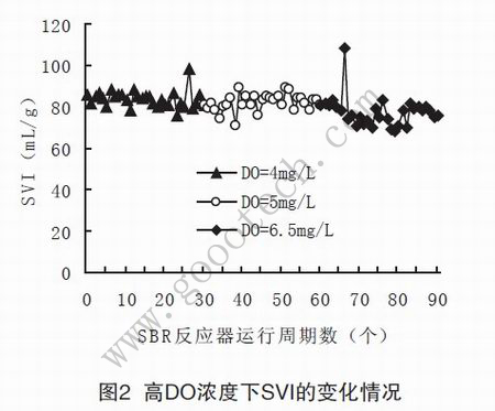2.1 高DO濃度對(duì)污泥沉降性能的影響好氧曝氣池內(nèi)混合液中的DO濃度一般認(rèn)為控制在2mg/L左右比較合適。為了考察高DO濃度對(duì)污泥沉降性能的影響,試驗(yàn)中控制反應(yīng)器DO濃度在4~6.5mg/L并運(yùn)行相當(dāng)長(zhǎng)的時(shí)間,試驗(yàn)結(jié)果如圖2所示。從圖2中可以看出,在DO=4~5mg/L時(shí),污泥體積指數(shù)(SVI)穩(wěn)定在85mL/g左右,當(dāng)DO達(dá)到6.5mg/L時(shí),SVI值反而略有下降,并且此時(shí)的上清液比較渾濁。這表明在啤酒廢水底物降解過(guò)程中,高DO濃度并不利于絲狀菌繁殖,由于污泥中絲狀菌較少,使其絮體松散、脆弱,在較大的曝氣量下,被分裂成為細(xì)小零碎的絮體,導(dǎo)致上清液渾濁。