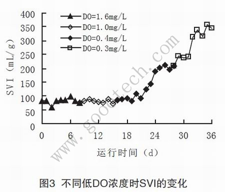 為了考察低DO濃度對(duì)活性污泥沉降性能的影響,在不同低DO濃度(DO=0.2~1.6mg/L)下進(jìn)行了大量試驗(yàn),圖3是DO濃度從1.6mg/L逐漸降低時(shí)SVI的變化情況。試驗(yàn)結(jié)果表明,反應(yīng)過(guò)程中,DO濃度低時(shí)能改變污泥沉降性能而引發(fā)污泥膨脹。在本試驗(yàn)條件下,當(dāng)DO濃度降低至0.4mg/L時(shí),SVI升高至210mL/g左右,導(dǎo)致污泥膨脹發(fā)生。在此之后,又進(jìn)一步降低DO濃度,結(jié)果污泥膨脹進(jìn)一步加劇。