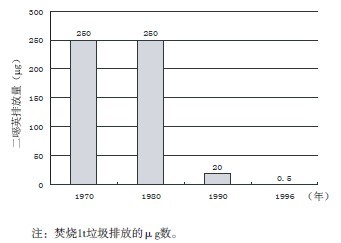 德國(guó)垃圾焚燒廠二惡英排放量從1970年的250μg/t下降至1996年的0.5μg/t(見下圖)。