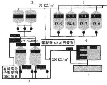 (4)污泥儲(chǔ)罐:儲(chǔ)存濃縮后的污泥,通過(guò)污泥泵提升至污泥脫水前儲(chǔ)罐(一座,容積1000m3)。提升過(guò)程中,在管線中加入混凝劑K2,劑量為20L/m3污泥,以提高污泥的可脫水性能。
