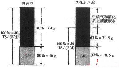 由圖3可知,在每個(gè)居民每天產(chǎn)生的80g原污泥中80%為有機(jī)物,20%為無(wú)機(jī)物;消化后剩下的固體物質(zhì)50g,其中有機(jī)物占63%,無(wú)機(jī)物占37%。進(jìn)污泥消化罐的原生污泥有機(jī)物的量為8.7t/d,再生污泥中有機(jī)物的量為6.59t/d,總共進(jìn)行消化的污泥有機(jī)物的量為15.29t/d(GVo)。