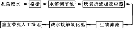 以大理州巍山縣興巍民族工藝廠的扎染廢水為 原水,考慮到該廢水中氮、磷濃度偏低,為了提高生 物處理效果,將扎染廠廁所和食堂的污水引入水解 調(diào)節(jié)池與扎染廢水充分混合。所排廢水主要為黑 色、藍(lán)色或棕色,具有有機(jī)物濃度高、色度大、難降解 等特點(diǎn)。試驗(yàn)流程見(jiàn)圖1。