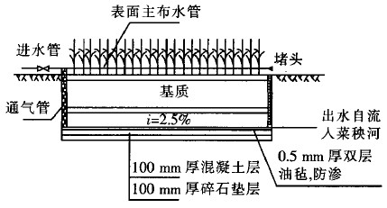 試驗(yàn)在大理州巍山縣興巍民族工藝廠內(nèi)進(jìn)行。 垂直潛流人工濕地由磚和水泥砌成,用隔墻分為4 格,從南至北依次種植蘆葦、水芹菜、菖蒲和美人蕉, 種植密度均為9株/m 。每塊濕地的平面尺寸均為 3 m X 12 m,有效高度為1 In,池底坡度為2.5%。 人工濕地內(nèi)的基質(zhì)分為4層:第一層為表層,填 充100 mm厚、粒徑為8~16 mm的礫石,其作用是 防止砂層表面沖蝕;第二層為過(guò)濾層,填充500 mm 厚、粒徑為0.2~6 mm 的無(wú)泥粗砂,其作用是進(jìn)行 生化處理;第三層為過(guò)渡層,填充100 mm厚、粒徑 為4~8 mm的礫石,其作用是防止上層砂粒堵塞下 排水層;第四層為排水層,填充300 mm厚、粒徑為8 ~ 16 mm的礫石,其作用是匯集并排出已處理的廢 水。濕地底部鋪0.5 mm的PE膜雙面土工布,防止 廢水滲透地下。人工濕地構(gòu)造見(jiàn)圖2。