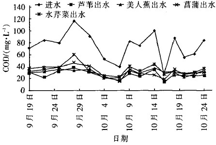 | 圖3 4種不同植物濕地對(duì)COD的去除效果 |