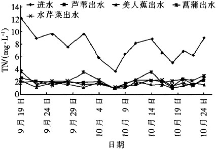 | 圖4 4種不同植物濕地對(duì)TN的去除效果 |