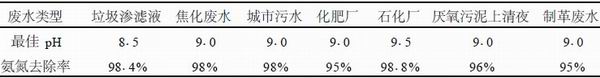 國(guó)內(nèi)外的研究人員對(duì)MAP法處理氨氮廢水的 最佳pH值進(jìn)行了研究,結(jié)果如表1所示。