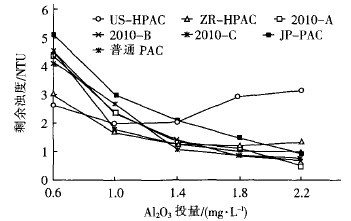 為了適應(yīng)國內(nèi)對(duì)高純、高濃但價(jià)格不高的PAC 的市場需求,深圳中潤公司推出了“2010A、B、C”系列PAC新產(chǎn)品,其毒理指標(biāo)達(dá)到歐美PAC同等水平,但混凝效果(同等氧化鋁)高于歐美PAC約 30% ,售價(jià)(同等氧化鋁)僅為歐美PAC的20% ~ 30% 。以深圳水庫原水(濁度為32.2 NTU,pH= 6.95,水溫為27℃ ,GT值為25 182)為例,對(duì)us— HPAC、JP—PAC與中潤公司產(chǎn)品(ZR—HPAC、2010 -A、2010-B、2010-C)的混凝效果進(jìn)行比較,結(jié)果見圖1。