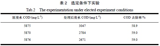 由表2 得知,在選定實(shí)驗(yàn)條件下,廢水COD 去除率在58 % 以上。