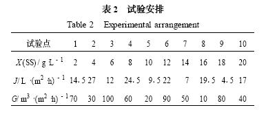 為了能夠在合理的試驗規(guī)模上擴(kuò)大各變量的取值范圍,使其包括所有實際運(yùn)行中可能出現(xiàn)的情況,本研究采用均勻設(shè)計法進(jìn)行試驗設(shè)計. 對曝氣強(qiáng)度( G) 、膜通量( J ) 和污泥濃度( X) 分別取10 個水平[ G :10~100m3/ (m2·h) ;J :415~27 L/ (m2·h) ; X :2~20 g/ L ] ,然后按照均勻設(shè)計表U11 (1110) 安排10 次試驗(詳見表2) ,在每次試驗中考察膜間液體上升流速及與之相應(yīng)的膜面污泥沉積速率. 膜間液體上升流速采用LS45 型旋杯流速儀(水利部重慶水文儀器廠生產(chǎn)) 測定. 膜面污泥沉積速率通過測定膜過濾壓差的變化,計算膜過濾阻力,采用膜過濾阻力隨時間的上升速率進(jìn)行間接表征.