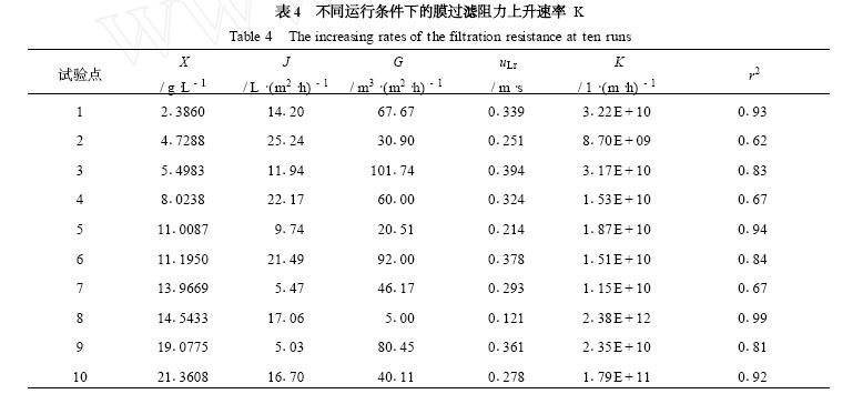表4 列出了各試驗點中膜過濾阻力上升速率( K) 的計算結(jié)果. 其中所列uLr值是根據(jù)式(1) 計算得到的清水時對應(yīng)曝氣強(qiáng)度( G) 下的膜間液體上升流速[8 ] .