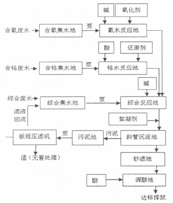 電鍍廢水總的治理原則是水質(zhì)不同,分而治之。一般分為含鉻廢水、含氰廢水、含重金屬離子綜合廢水等。在此我們應(yīng)用化學(xué)法對廢水進(jìn)行成熟有效的處理,此工藝具有實(shí)用性、高效性、穩(wěn)定性等特點(diǎn)。