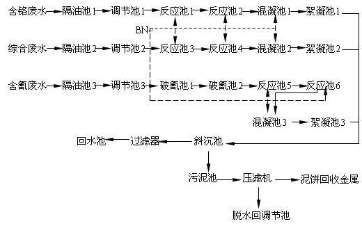 電鍍廢水的組成成分復(fù)雜,若將各種廢水混合在一起處理,由于水量較大,污染物復(fù)雜,而含重金屬和氰化物廢水處理工藝的反應(yīng)條件不同,會(huì)造成投資及運(yùn)行費(fèi)用大大增高。因此,本BN法將電鍍廢水分成三條線來(lái)處理,其具體的工藝流程如下:
