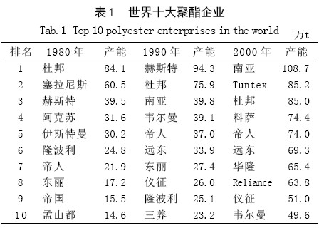 聚酯是化纖工業(yè)的重要原料,是由二元醇或多元醇和二元酸或多元酸縮聚而成的一類高分子化合物的總稱。聚酯通?煞譃轱柡途埘ズ筒伙柡途埘2 大類,飽和聚酯產(chǎn)品主要有聚對(duì)苯二甲酸乙二酯(PET)和聚對(duì)苯二甲酸丁二酯(PBT)等,而不飽和聚酯產(chǎn)品主要有聚酯玻璃鋼增強(qiáng)塑料等。世界聚酯市場(chǎng)分布不集中,世界10大聚酯企業(yè)占全球聚酯市場(chǎng)的比例超過(guò)三分之一,近20年來(lái)世界十大聚酯企業(yè)產(chǎn)能排行見表1 。