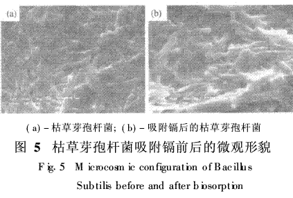 由圖5(a)可以看出,枯草芽胞桿菌為長桿狀,長度大約為6μm,粗約0·7~0·8μm,以芽殖方式繁殖,芽胞常存在于菌體中央或稍偏,芽胞形成后菌體并沒有膨大,自然狀態(tài)下,分散,表面色澤也較暗淡。由圖5(b)可以看出,枯草芽胞桿菌吸附鎘后,細(xì)胞體略顯膨大,表面色澤變亮,有研究表明,溶液中的重金屬離子與細(xì)胞內(nèi)的陽離子發(fā)生交換,使大量金屬離子聚集在細(xì)胞表面,其導(dǎo)電作用使吸附后的細(xì)胞明顯比吸附前明亮,清晰。由于在吸附過程中,細(xì)胞分泌一些大分子物質(zhì),使部分細(xì)胞粘連,致使細(xì)胞表面粗糙。