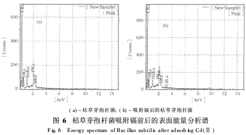 由圖6(a)和圖6(b)可知,未吸附鎘的枯草芽胞桿菌,細(xì)胞表面含有C,N,O,P,S,Na等元素,且C,O,N,P的峰均較強(qiáng)。吸附鎘后,出現(xiàn)了鎘峰。由表1可以看出,Na的含量減少,表明在此吸附過程中,有離子交換吸附存在。由于C,N,O,S,P的含量均有變化,推測有絡(luò)合、載體跨膜運(yùn)輸?shù)茸饔么嬖?使細(xì)胞質(zhì)從細(xì)胞膜中流出,致使吸附后枯草芽胞桿菌的形體膨大。